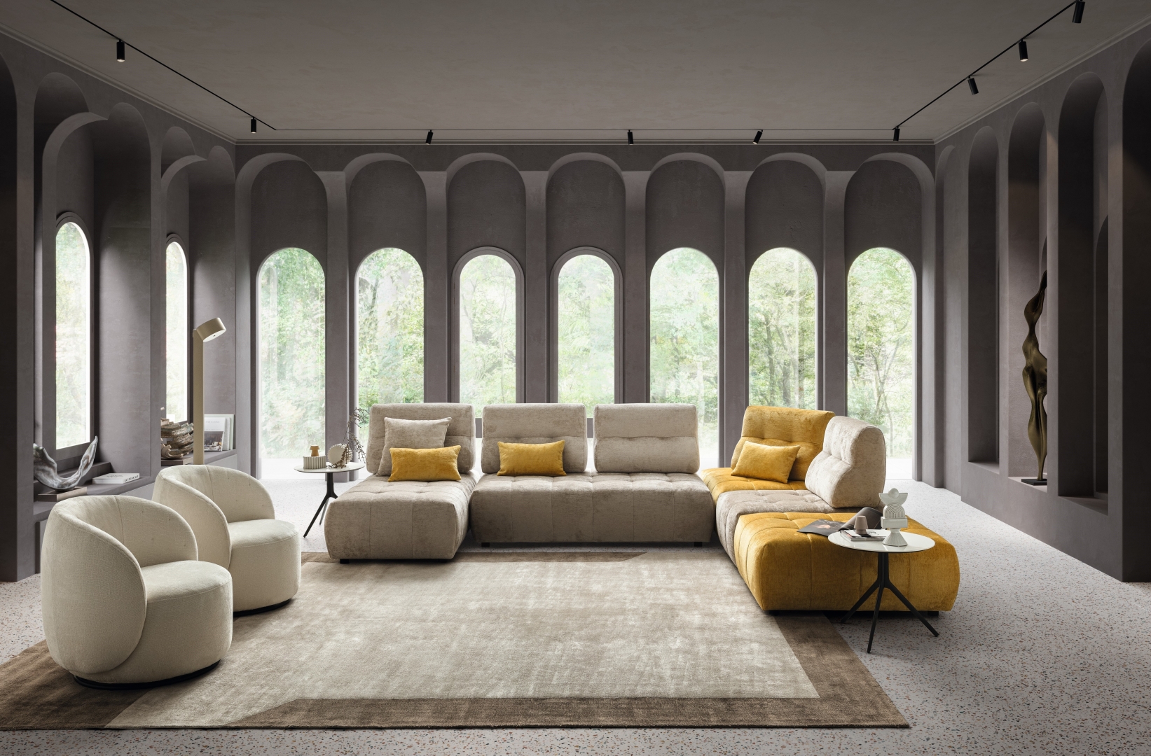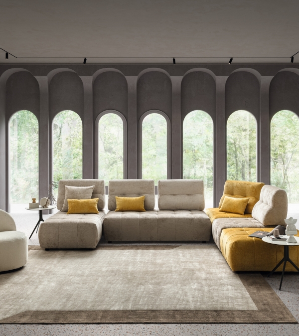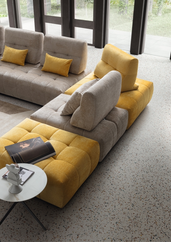 Divano modulare con schienale traslante. Con un unico movimento puoi scegliere tra due differenti profondità. Grazie ai meccanismi di questo divano puoi far scorrere gli schienali avanti e indietro.