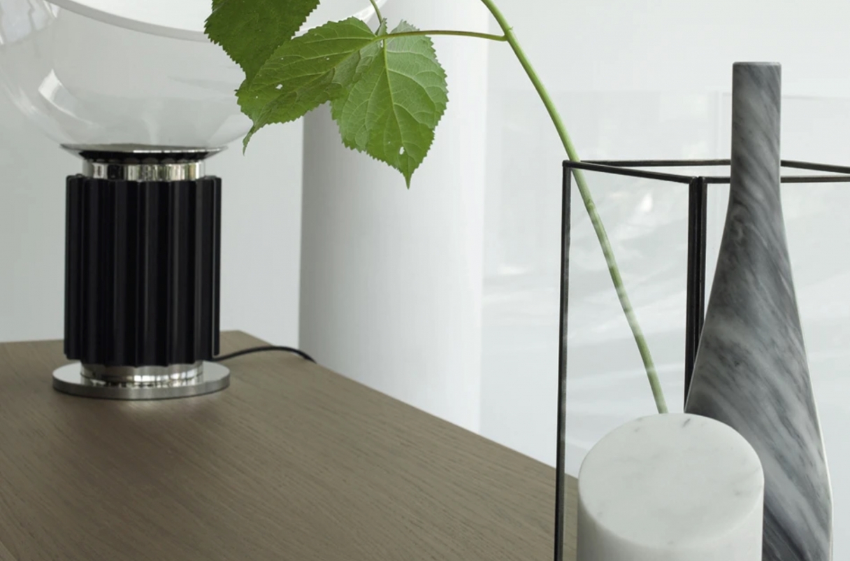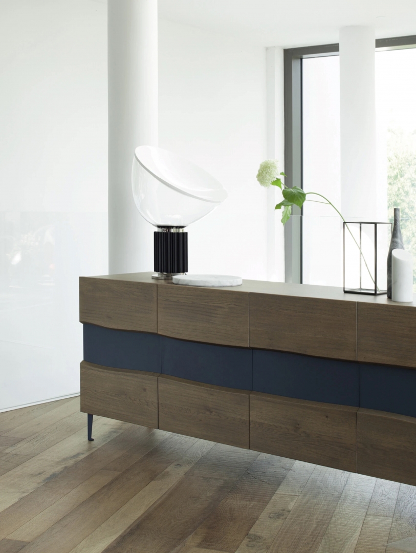 La finitura ella banda centrale crea ritmo cromatico e sensoriale del frontale della madia.