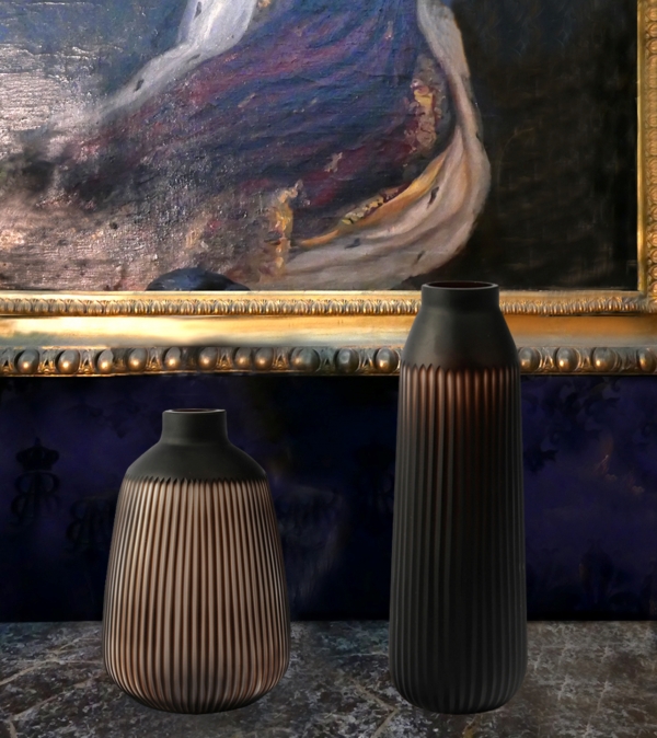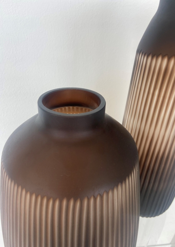Vasi in vetro cannettato in finitura opaca color bronzato in 2 misure.