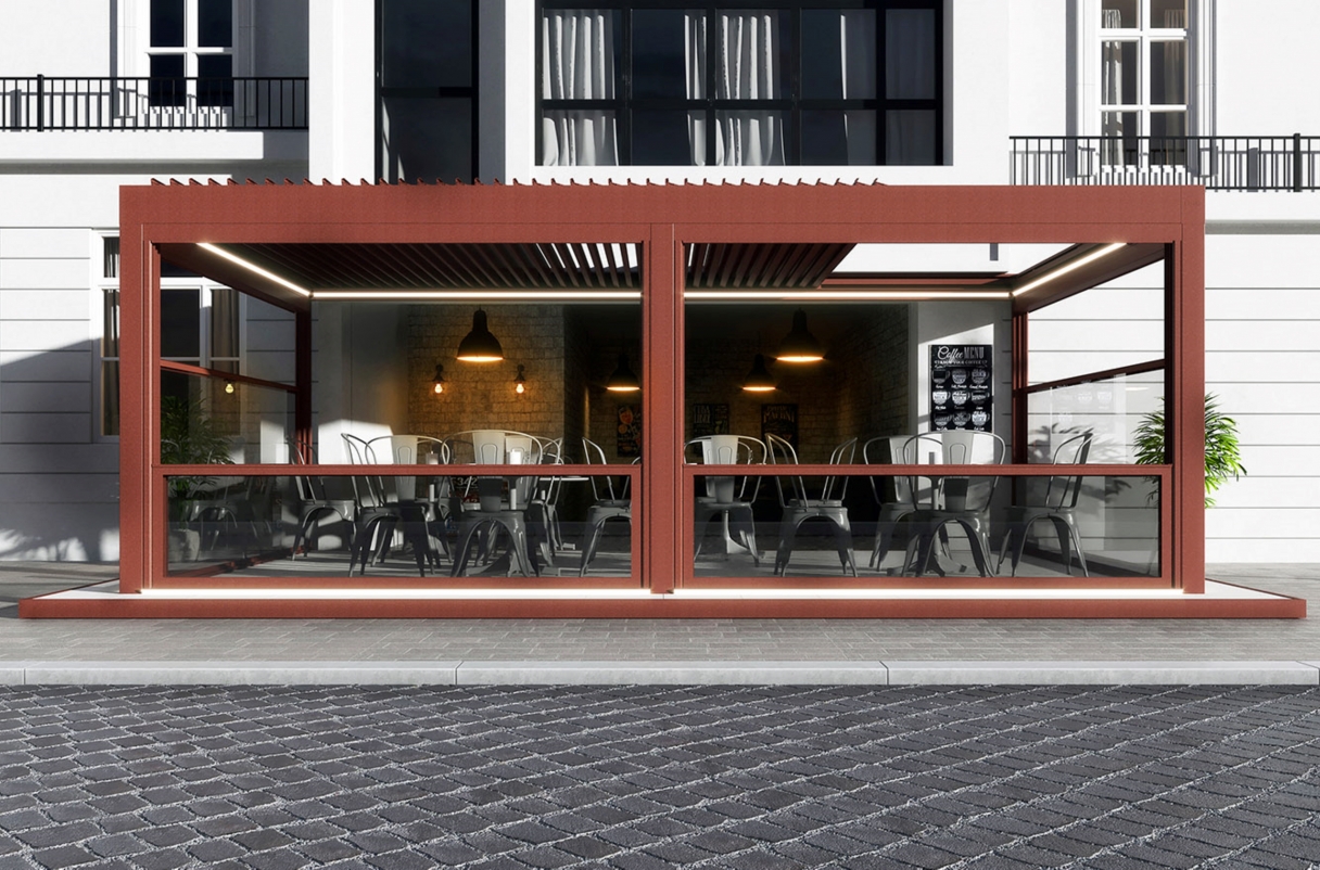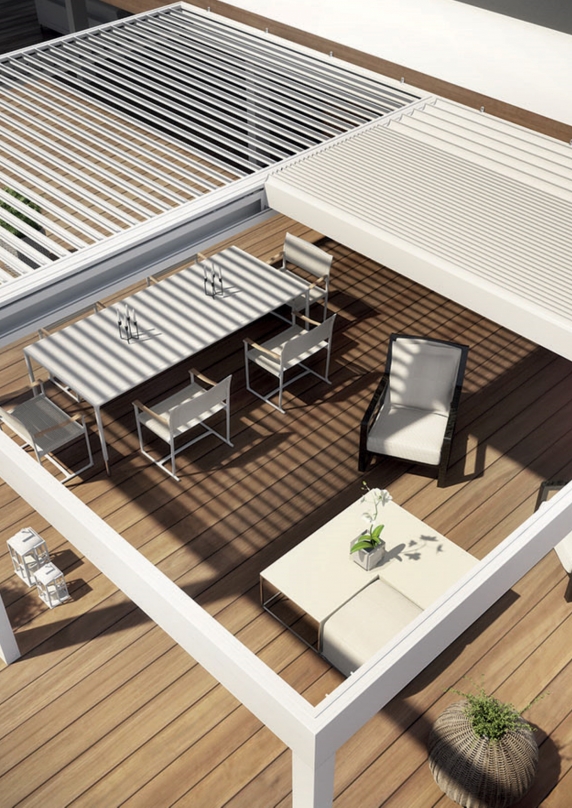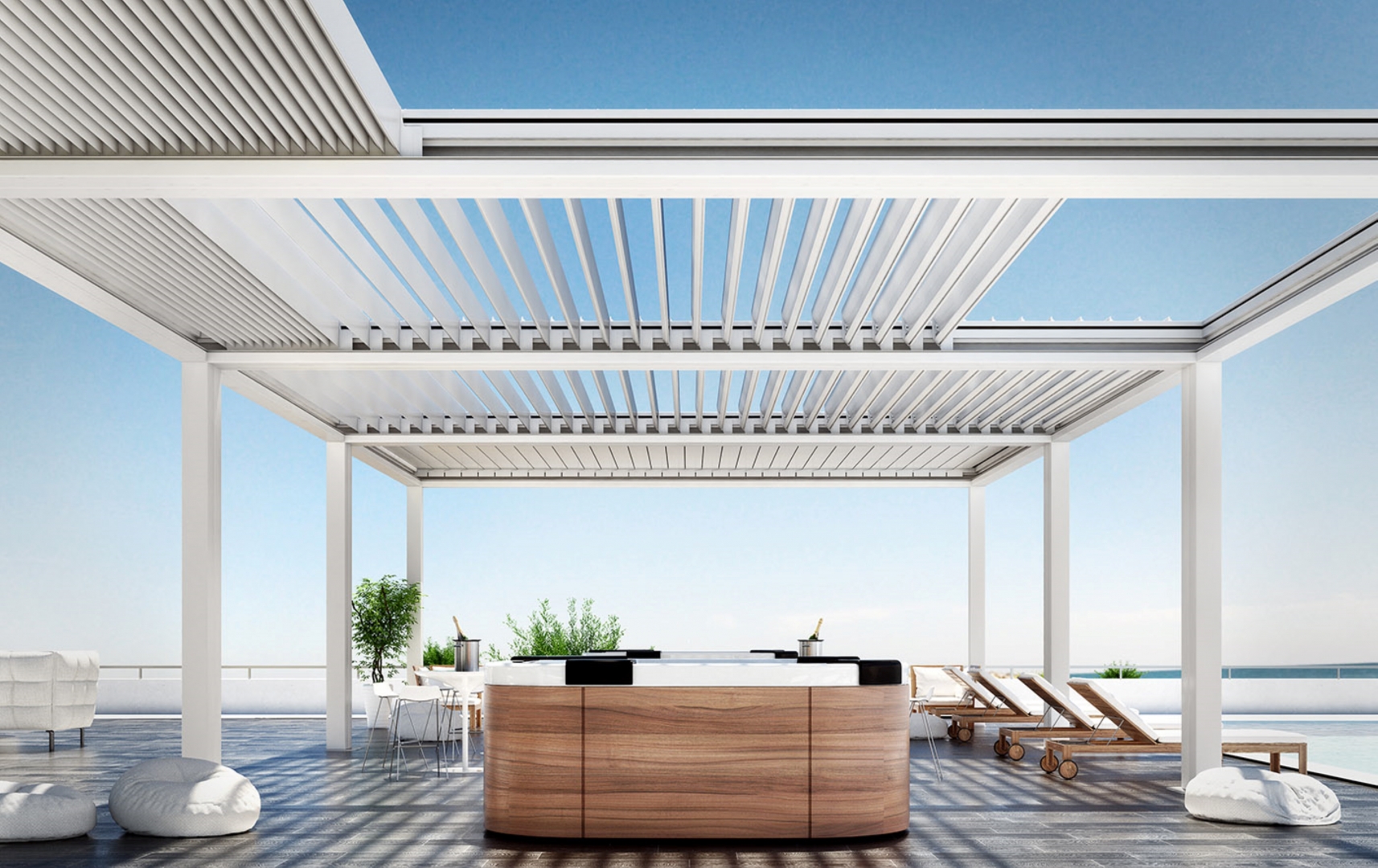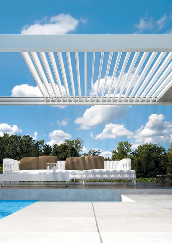 Pergola bioclimatica di nuova generazione con lame orientabili ed impacchettabili con movimenti autonomi esensore di pioggia.