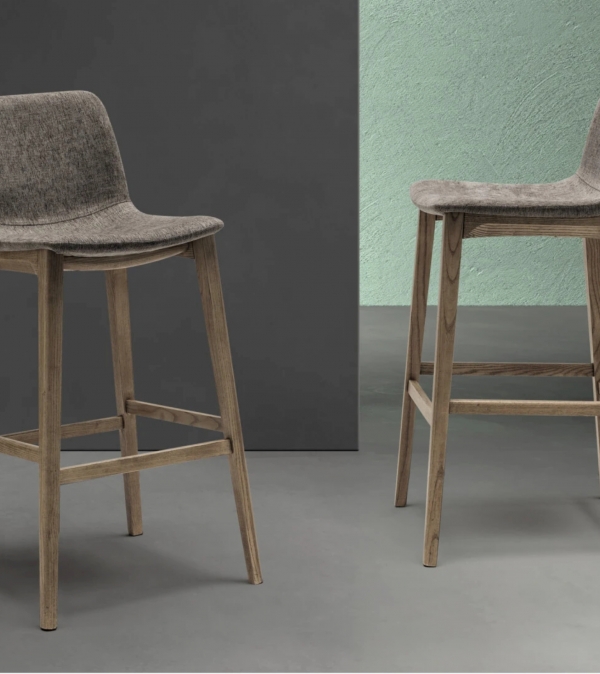 Sgabello dal look moderno e dinamico Il colore del tessuto può essere abbinato tono su tono o a contrasto con la tonalità della struttura in legno.