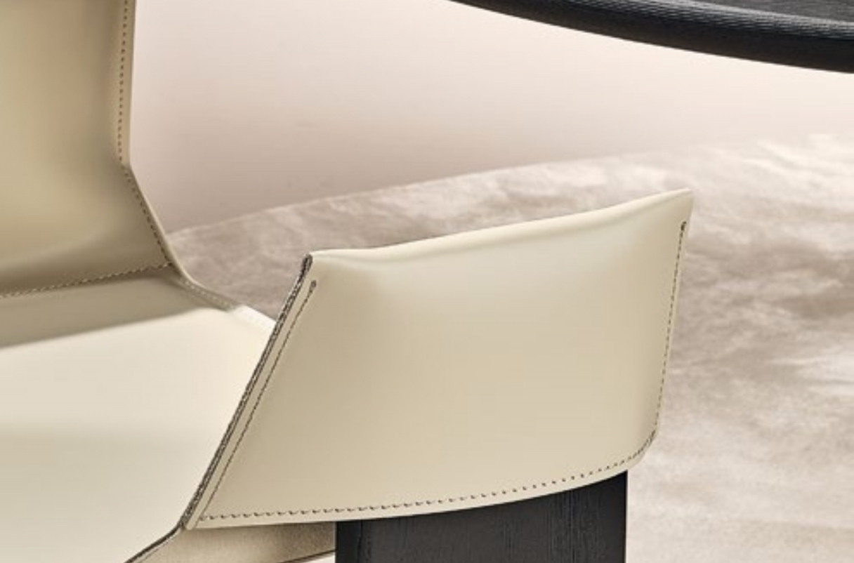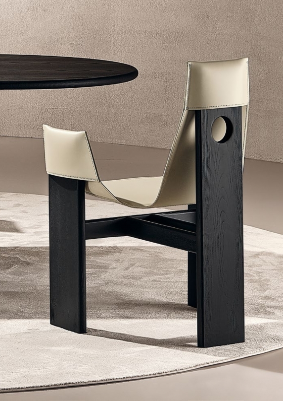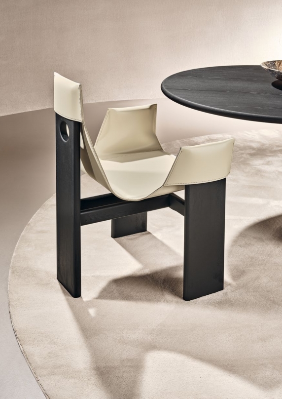 L'espressività Di questa sedia coniuga la purezza lineare della base in legno con la leggerezza ottica della seduta in pelle. Gli oggetti di uso quotidiano si trasformano in essenziali oggetti scultorei che aggiungono valore alla tua tavola.